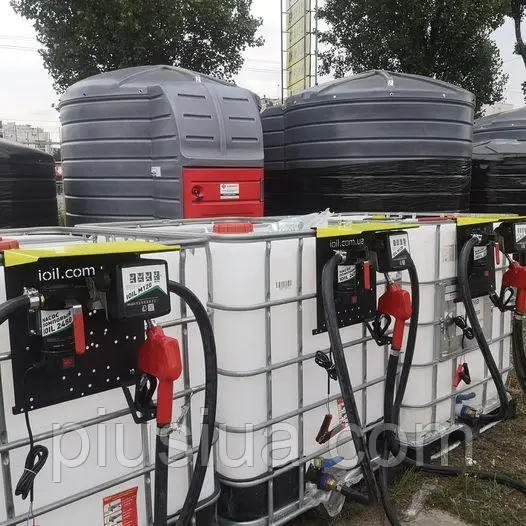 Компактна заправна станція на базі IBC-контейнера з насосом PIUSI (Італія), що працює від 220 В або 12/24 В із продуктивністю до 120 л/хв.