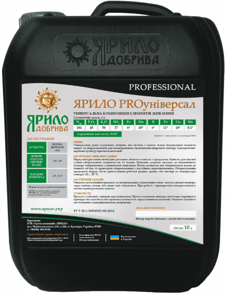 “Ярило PROуніверсал”-це універсальне рідке хелатоване добриво, яке містить у своєму складі збалансовану кількість макро- та мікроелементів для позакореневого підживлення широкого спектру сільськогосподарських культур протягом вегетації за умов, коли порушується поглинання елементів з грунту N-184, P2O5-90, K2O-44, SO3-37, Fe-6, Mn-6, B-6, Zn-8, Cu-8, Mo-0.12, Co-0.05